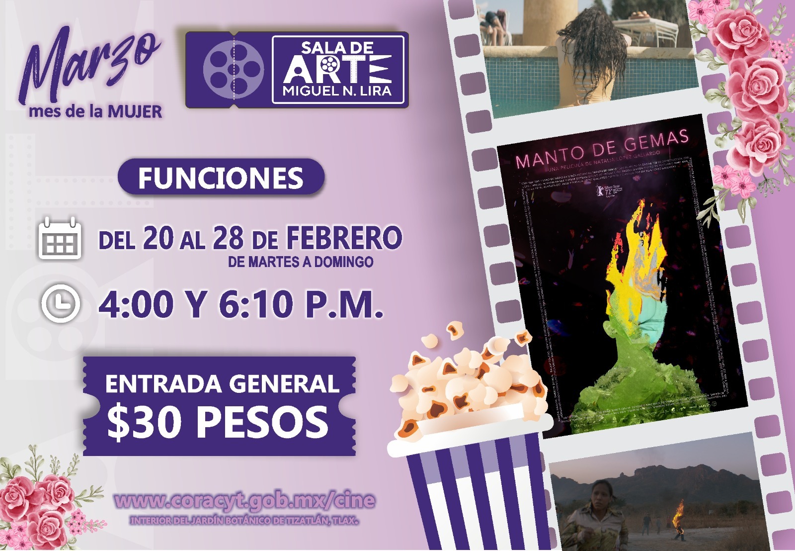 ¿Aburrido de los cines convencionales? La Sala de Arte Miguel N. Lira tendrá funciones de la película Manto de Gemas, del 20 al 28 de febrero con horarios de 4:00 p.m. a 6:19 p.m. La entrada tiene un costo de $30 pesos Consulta la cartelera competa en www.coracyt.gob.mx/cine