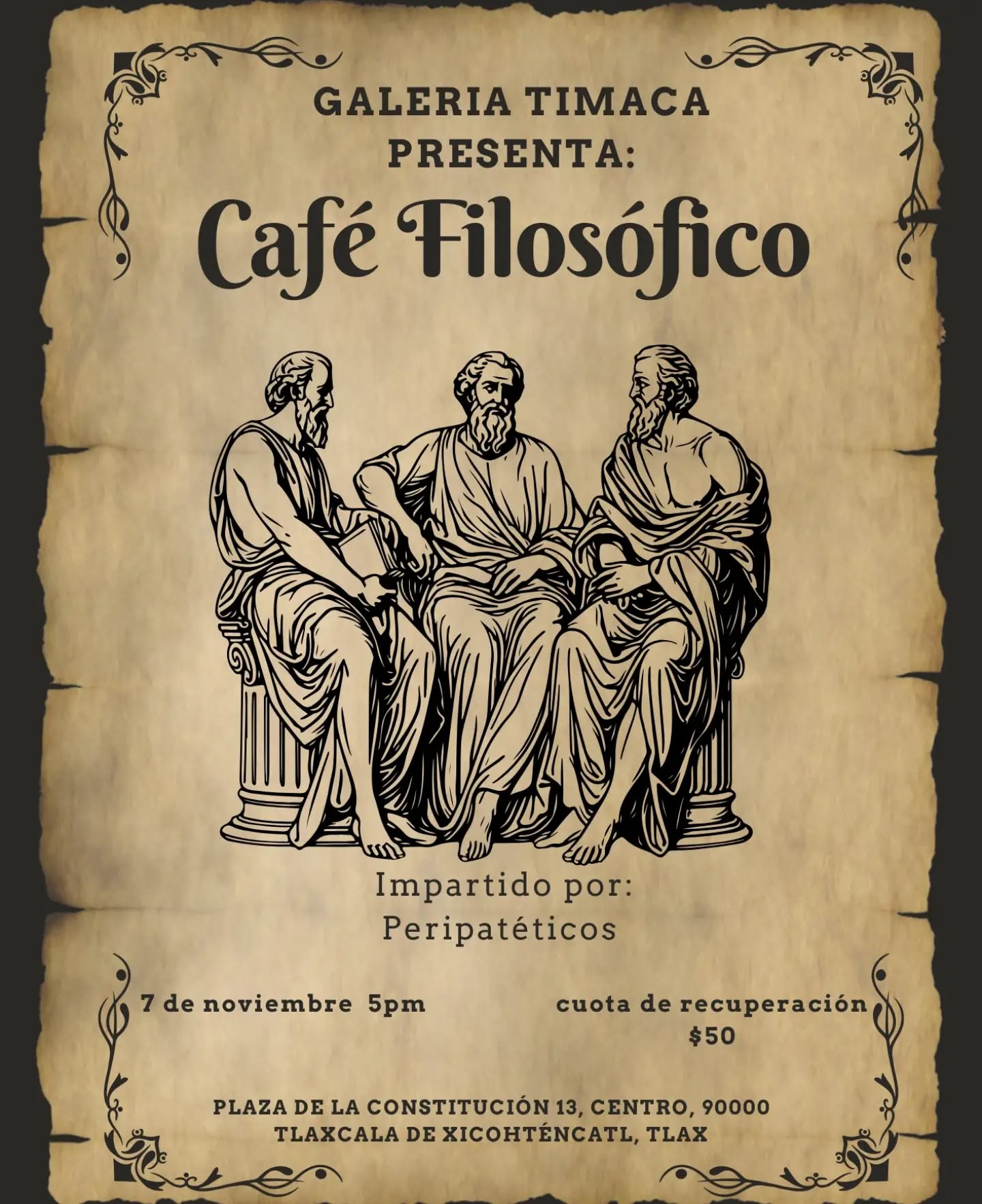 Desde la Galería Timaca de Templo Rojo se realizará el encuentro filosófico con @peri_pateticossss. El café filosófico se llevará a cabo el día 7 de noviembre a las 5:00 p.m. Cuota de recuperación: $50¡Ven y únete a la conversación filosófica en un ambiente acogedor para intercambiar ideas!