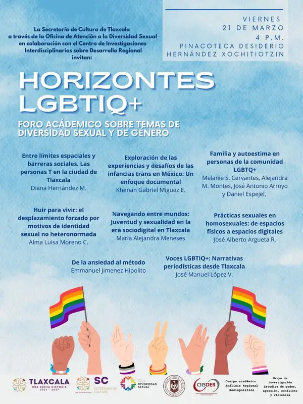 La Secretaría de Cultura de Tlaxcala en apoyo de la Oficina de Atención a la Diversidad Sexual de la Secretaría de Cultura Tlaxcala invitan a los talleres de creación literaria y creación poética en la Pinacoteca del Estado "Desiderio H. Xochitiotzin". Estás actividades son realizadas en el marco del Programa de Interacción Cultural y Social del Sistema de Apoyos a la Creación y Proyectos Culturales. Para mayores informes e inscripciones al teléfono: 2461229645 El taller llamado "Yosotre y la escritura de la violencia" será facilitado por Luecero Peña los días martes 18, 25 de abril, 2, 9 y 16 de mayo. De 16 a 18 hrs. El cupo será limitado. Te puede interesar este evento: Conversatorio Visibilidades Lésbicas y Bisexualas de Tlaxcala